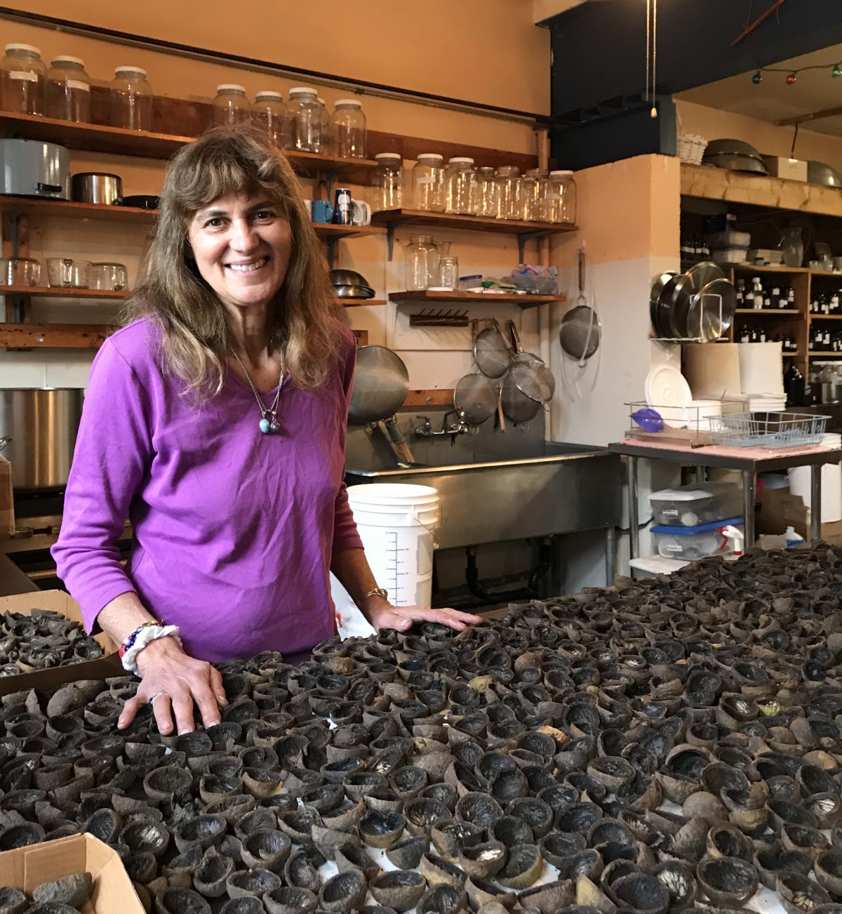 in the kitchen/laboratory of Wiseways Herbals, surrounded by walnut shells