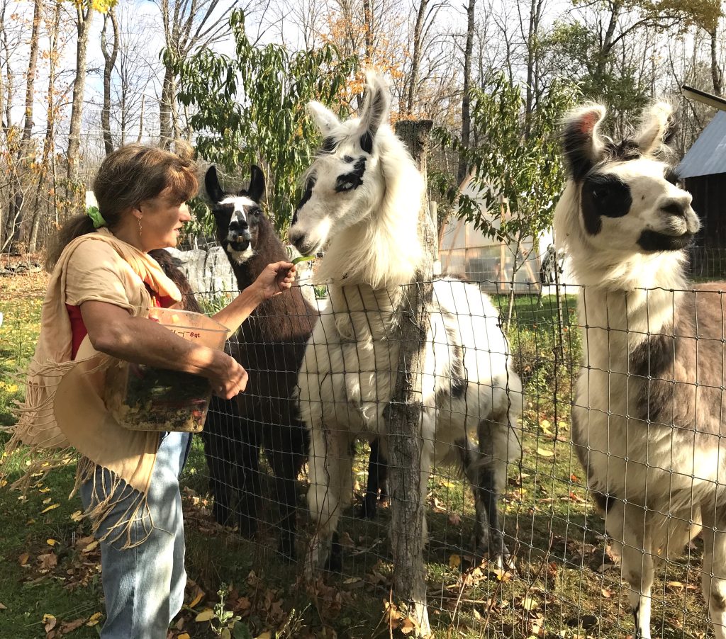 Laila getting nuzzled by a llama at Singing Brook Farm (photo, Jim Matus)